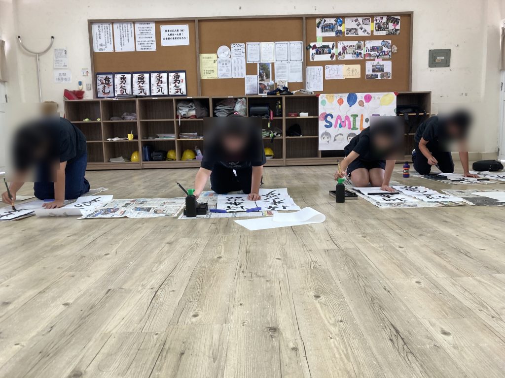 書き初め大会が行われました。小学部1・2年生が硬筆、小学部3年生以上は毛筆に取り組みました。
